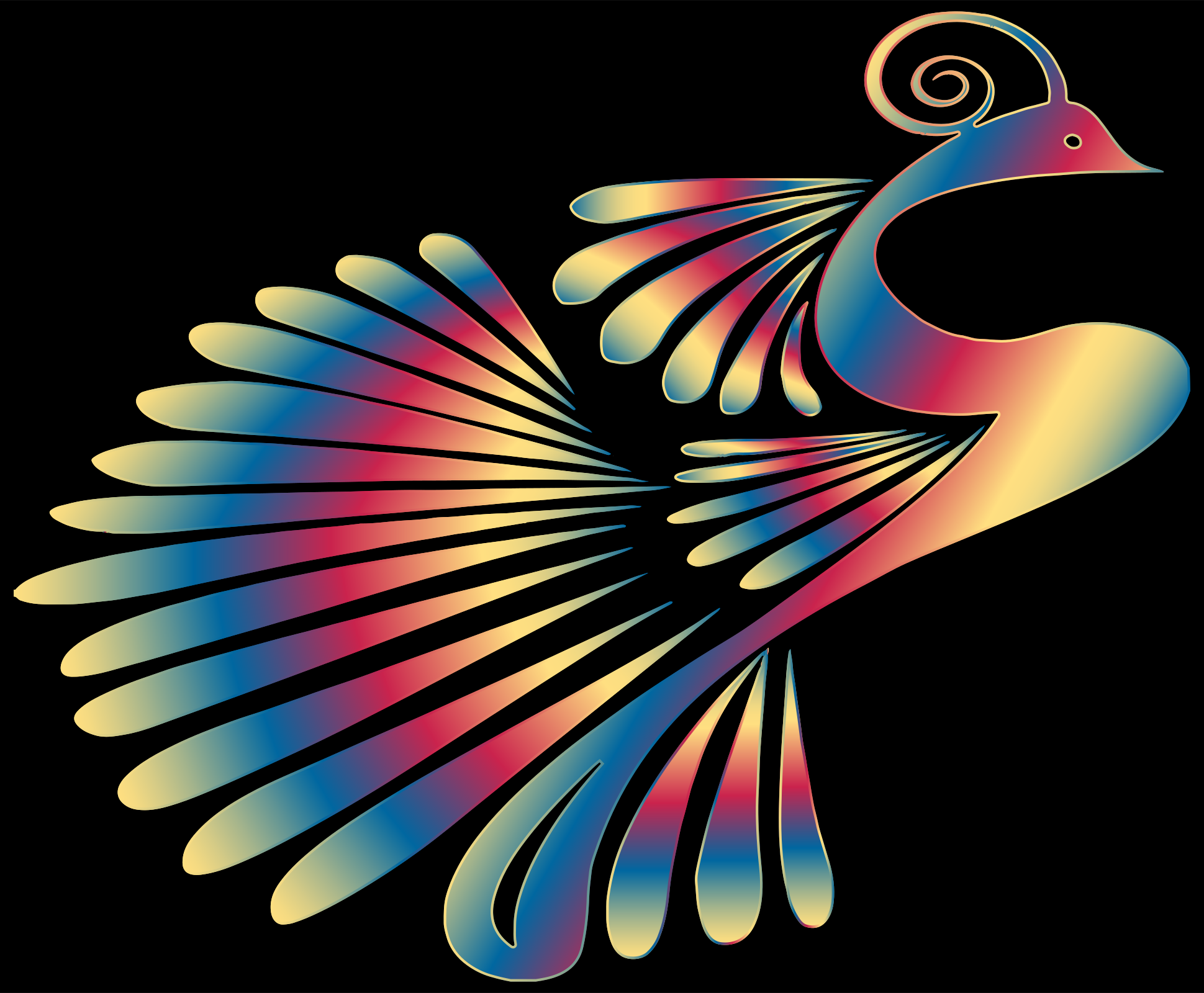 This features a colorful bird with long, flowing feathers. It has a rainbow-colored body and wings, giving it an eye-catching appearance. The bird's wings are spread out, showcasing its vibrant colors. The bird is perched on top of a black background, which contrasts beautifully with the bird's vivid hues. This artistic representation of a bird in flight creates a visually striking scene that captures attention and admiration.