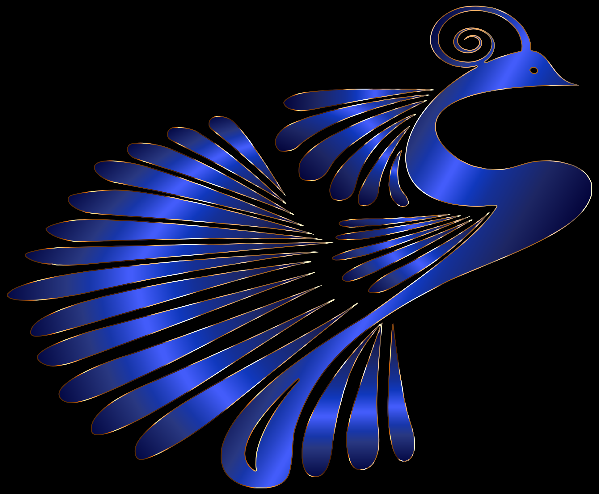 This features a blue bird with an intricate design, resembling a peacock. It has long feathers and a swirly pattern on its body. The bird is prominently displayed in the center of the image, taking up most of the frame. The background appears to be black, which emphasizes the vibrant colors of the bird's design. This artistic representation of a peacock showcases the beauty and elegance of this exotic creature.