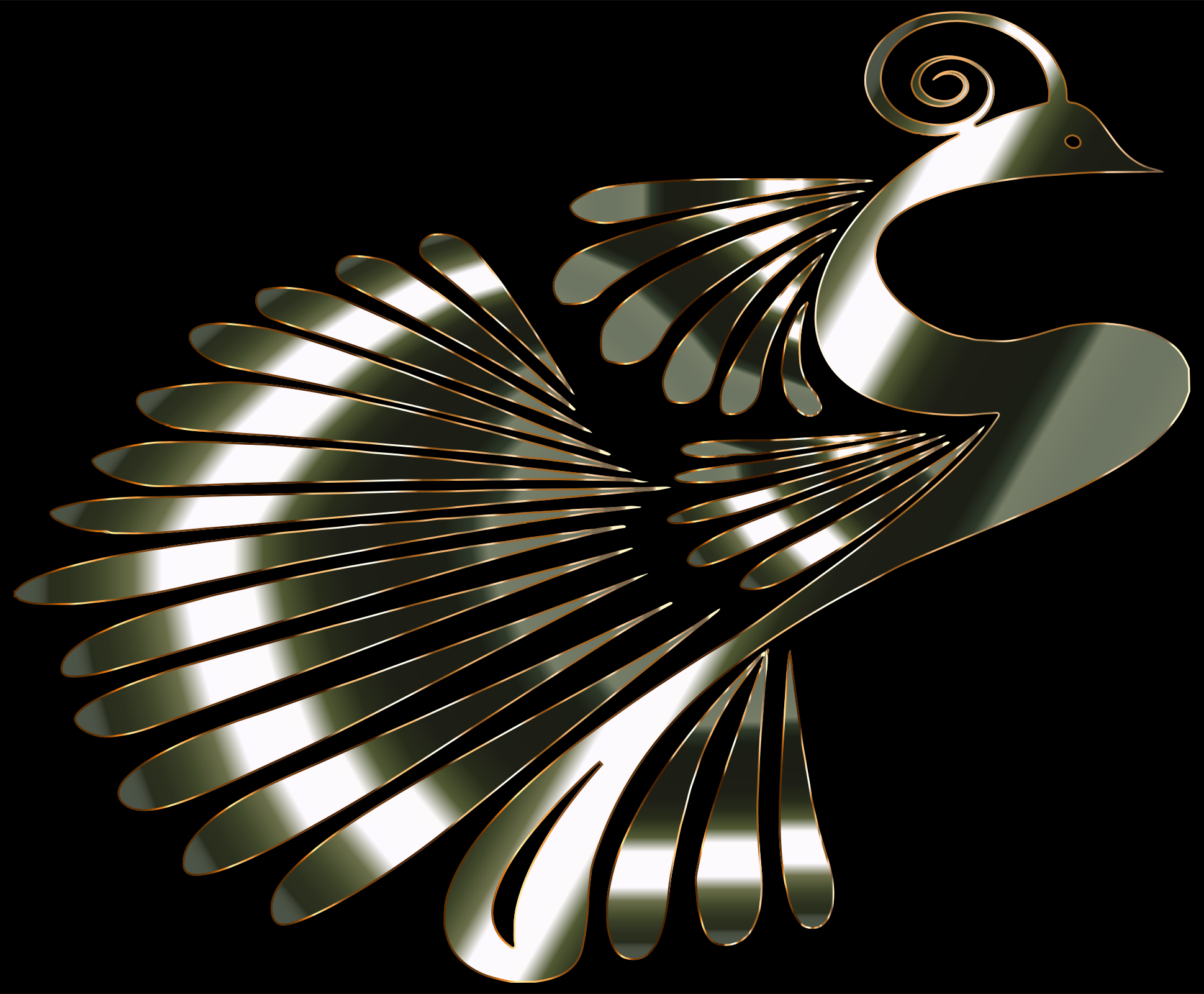 This features a beautifully crafted metal bird statue, which appears to be made of gold or silver. The bird is depicted with its wings spread wide, showcasing the intricate details and artistry involved in creating this sculpture. The bird's wings are adorned with swirls, adding an extra touch of elegance and sophistication to the overall design. This unique piece of artwork serves as a captivating focal point for any space where it is displayed.