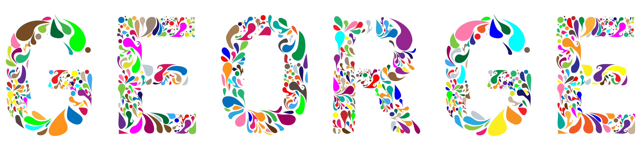 This is a colorful collage of the name "George" in various colors and shapes. The letters are arranged in such a way that they spell out the word "George." The different colored letters create an eye-catching and vibrant display, making it an interesting visual piece. This artwork could be used for decoration or as a unique form of typography to showcase creativity and individuality.