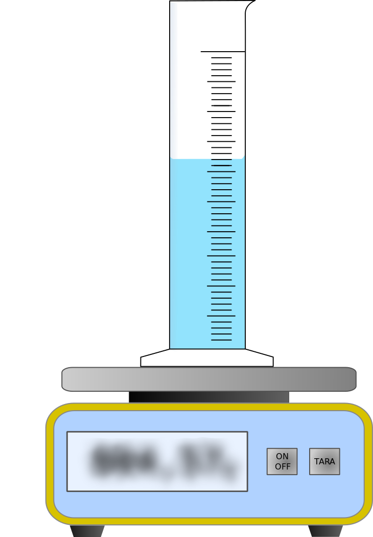 This features a blue measuring cylinder, which is filled with liquid and placed on top of a weight measurement tool. This device appears to be used for accurately measuring the volume of liquids or other substances. The cylinder's positioning suggests that it has been recently filled or emptied, as it is not in its usual upright position. The overall scene gives an impression of precision and attention to detail when it comes to scientific measurements.