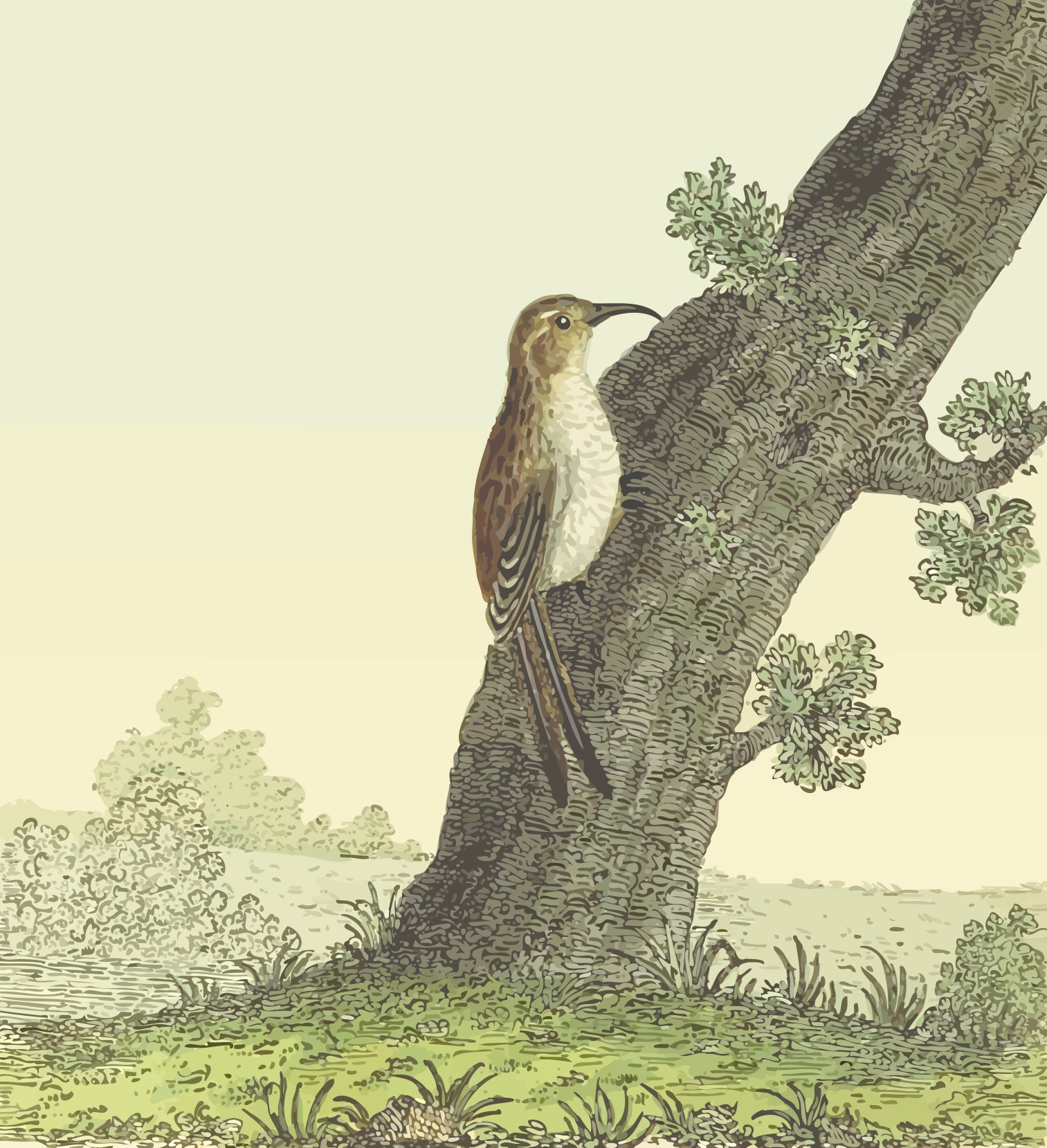 This features a bird perched on the branch of a tree. It is a small, colorful bird with a long tail and beak. The bird appears to be looking upwards as it sits on the branch. The scene takes place in an open field, providing a natural backdrop for the bird's presence.
