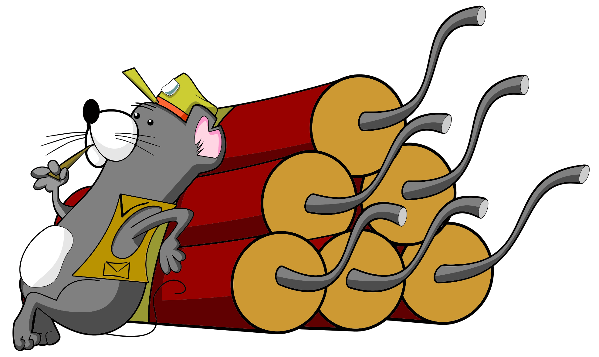 This features a cartoon mouse wearing a fireman's outfit, sitting on top of a pile of dynamite. The mouse is holding a pipe in its mouth and appears to be enjoying the situation. There are several other pipes scattered around the scene, some near the mouse and others further away. The overall atmosphere suggests that this could be an animated cartoon or comic strip.