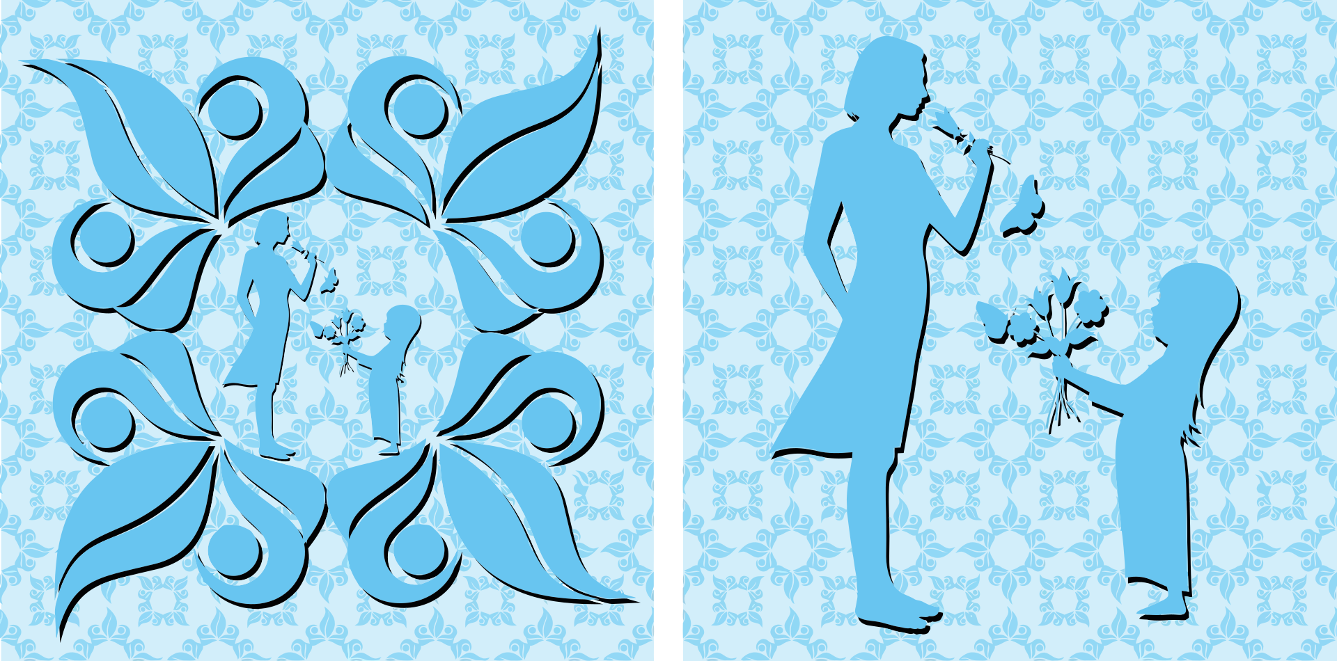 This features a woman holding flowers in her hand, standing next to a child. In the background, there is another person who appears to be playing an instrument. This scene is depicted twice, with one instance showing the woman and child on the left side of the image and the other instance showing them on the right side. The second instance also includes the musician in the background. The image has a blue color scheme, which adds a sense of calmness to the scene. There are two instances of a vase present in the image, one located near the center-left area and the other towards the top left corner. Additionally, there is a cup placed on the left side of the image, closer to the bottom. The combination of these elements creates an artistic and visually appealing scene.