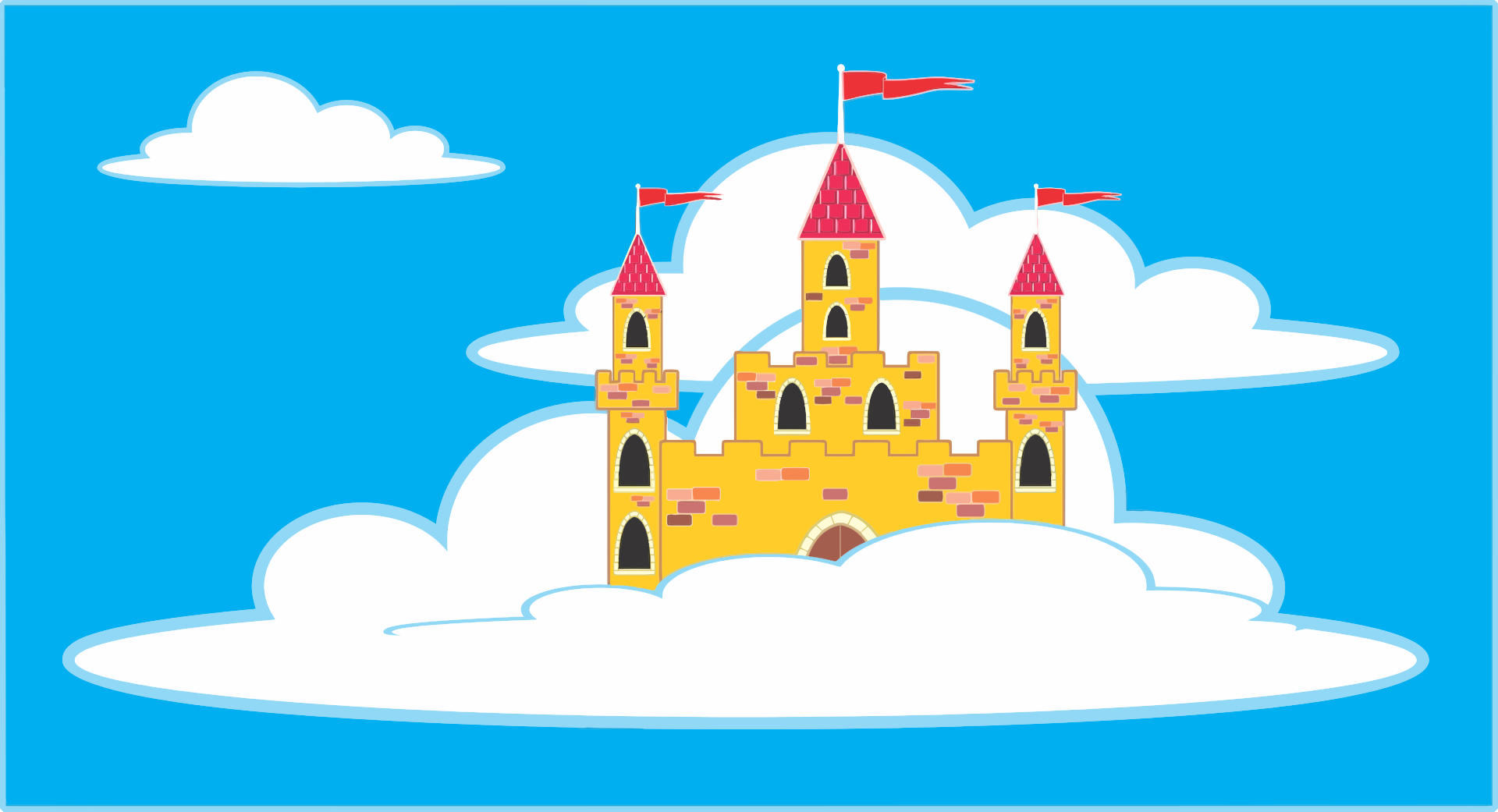 This features a large, colorful castle floating in the sky. It is surrounded by clouds and appears to be made of bricks. The castle has several turrets and towers, giving it an impressive appearance. In addition to the castle, there are two flags flying above it, adding to its grandeur. This whimsical scene creates a sense of wonder and imagination, as if the viewer is looking at a painting or drawing come to life.
