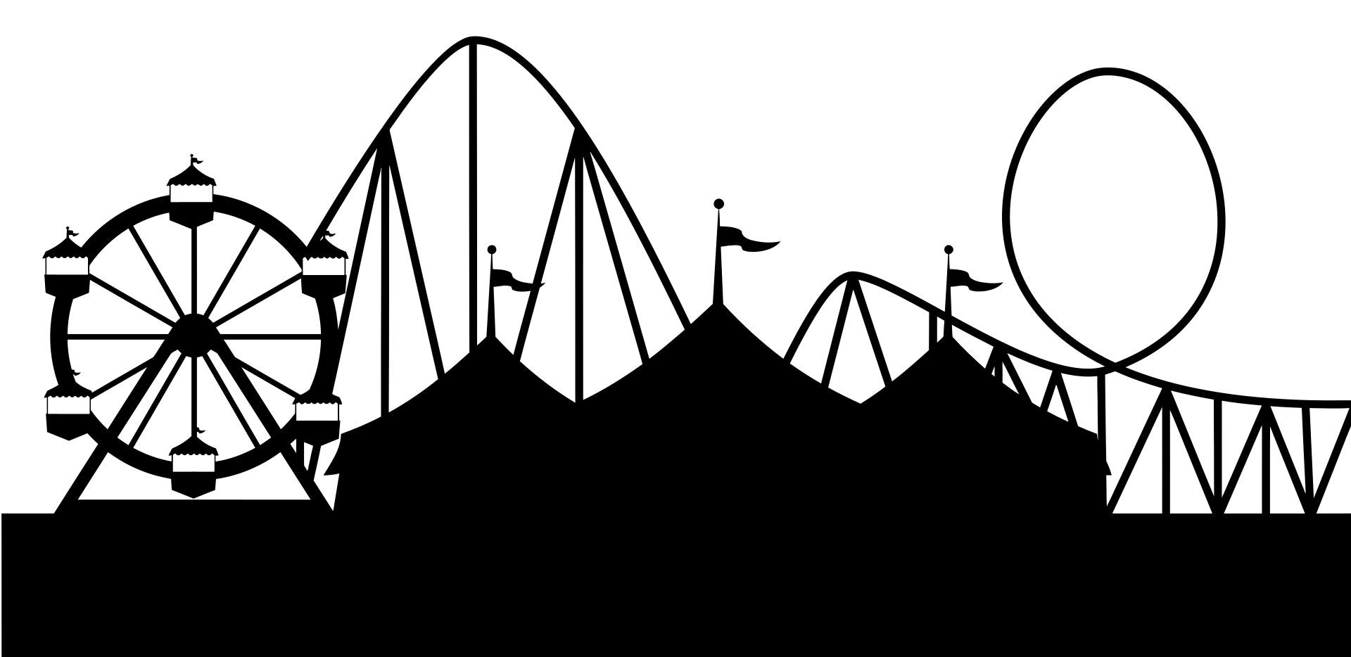 This features a black and white silhouette of an amusement park with various rides. There is a large Ferris wheel in the center, surrounded by smaller carnival rides such as roller coasters and a merry-go-round. In addition to these rides, there are several flags flying above the park, adding to its festive atmosphere. The silhouette of the amusement park is set against a backdrop of buildings, creating an interesting contrast between the playfulness of the carnival and the more serious nature of the surrounding structures.