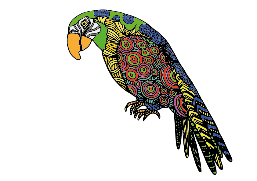 This features a colorful parrot perched on top of a white background. The bird is the main focus, and its vibrant colors make it stand out against the plain backdrop. The parrot's wings are spread wide, giving an impression of freedom and grace. Its beak is open, possibly indicating that it is either singing or calling out to someone. The overall scene creates a sense of liveliness and energy, with the bird being the center of attention in this artistic composition.