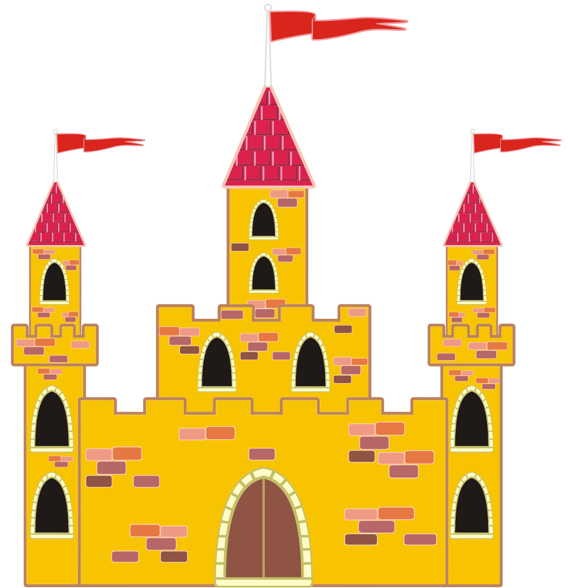 This features a yellow castle with red turrets and flags flying on top. The castle has a large brick design, giving it an old-fashioned appearance. There are several windows visible throughout the structure, adding to its charm. In addition to the castle, there is a small flag in the foreground, further enhancing the scene's visual appeal. Overall, this image captures the essence of a classic fairy tale setting with its vibrant colors and intricate design elements.
