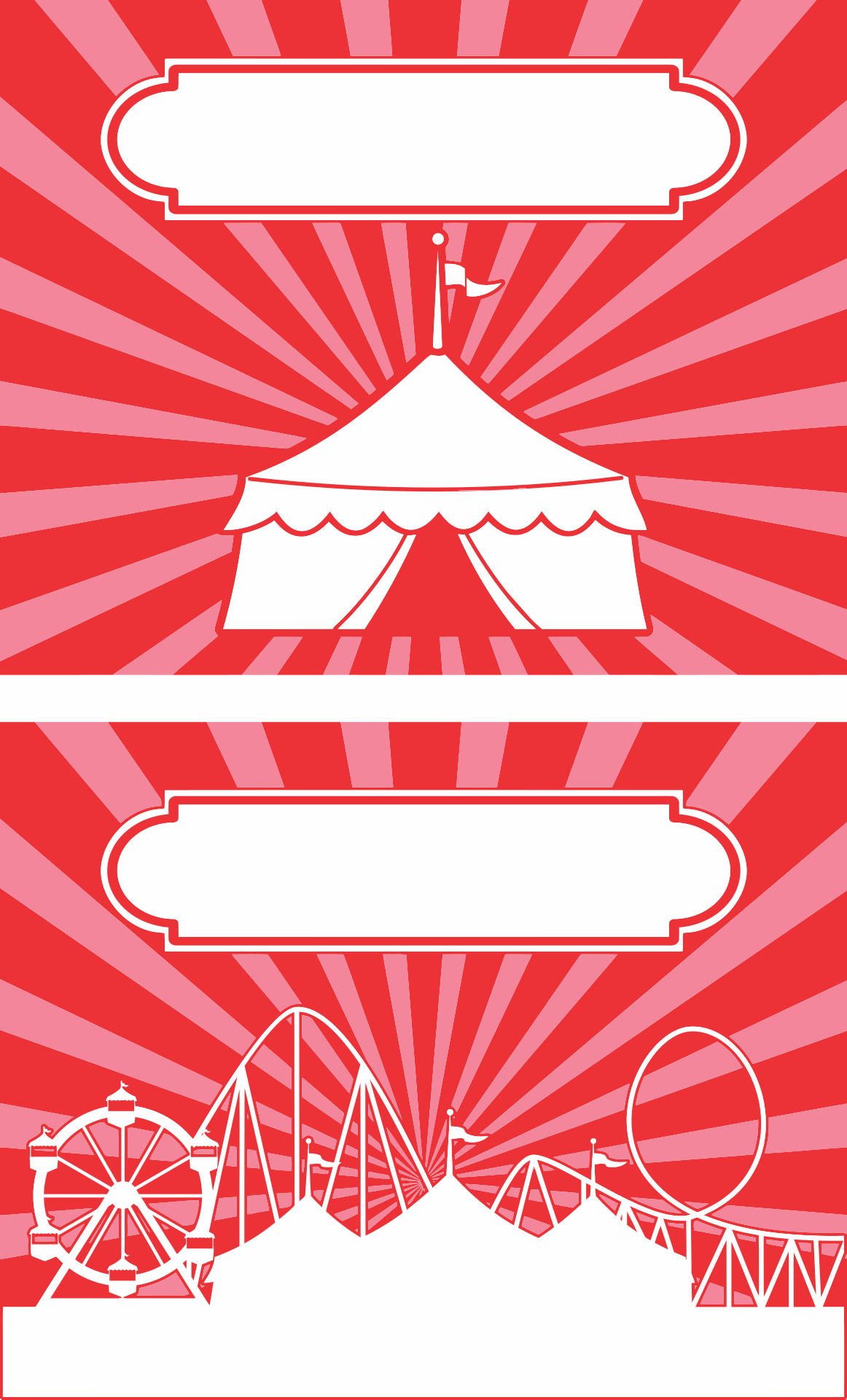 This features a red and white color scheme with various carnival rides and tents. There are three different pictures of the same carnival, each showing a different perspective on the scene. In one picture, there is an amusement park with a Ferris wheel, while in another, there is a circus tent with a large top. The third image showcases a carousel ride, adding to the variety of attractions at this festive event. Overall, the image captures the excitement and fun atmosphere of a carnival or amusement park.
