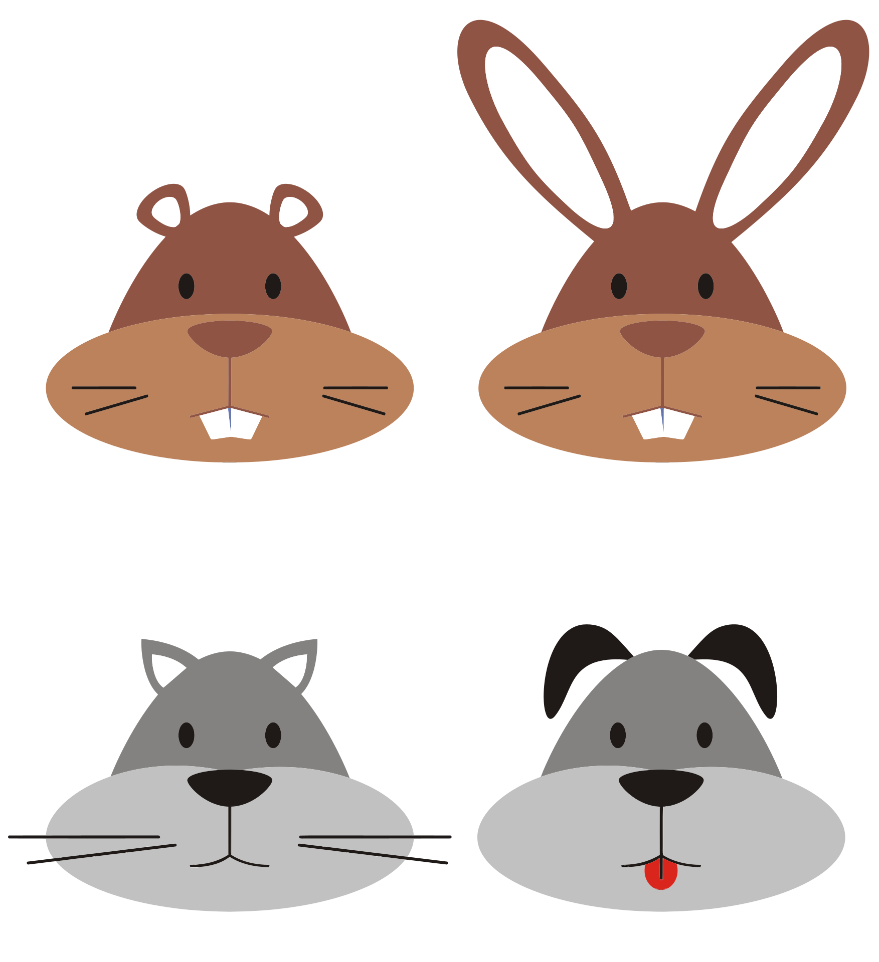 This features a collection of four different animal heads, each with unique characteristics. Two of the animals are rabbits, one on the left and another in the middle, while the other two are dogs, one on the right side and the other at the bottom. Each animal has distinctive facial features such as ears, eyes, noses, and mouths, making them easily identifiable. The rabbit on the left has a smaller nose compared to the one on the right, which is larger and more prominent. Additionally, the dog in the middle has a slightly different ear shape than the other two dogs. Overall, this image showcases a diverse group of animals with distinctive features.