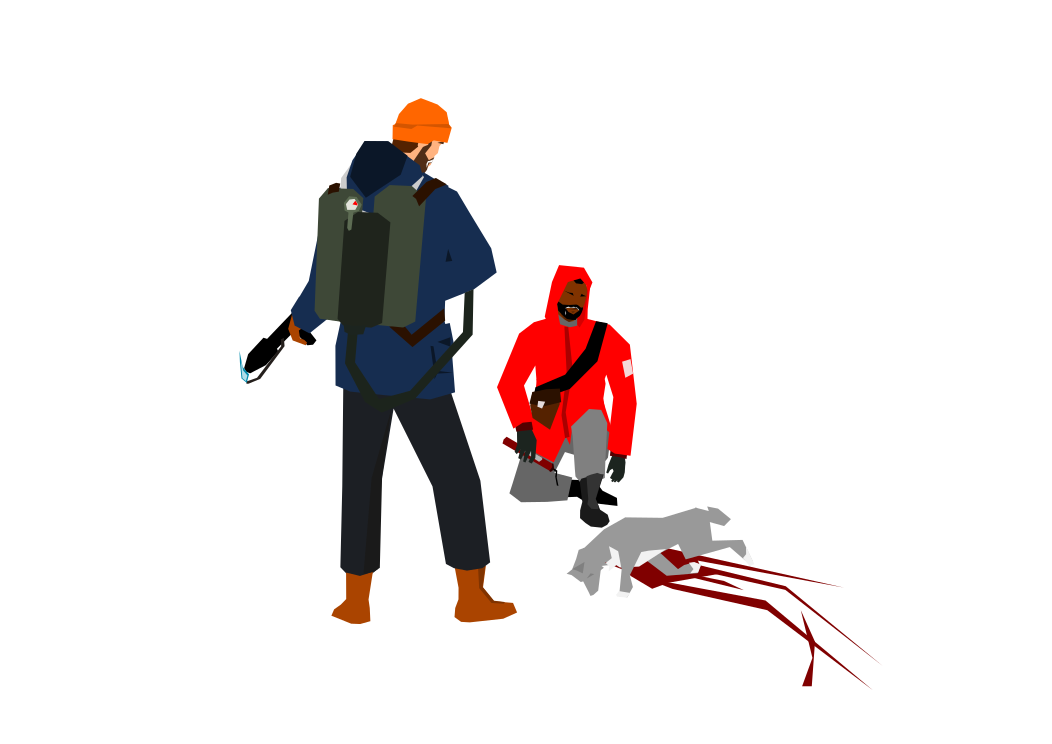 This features a man and a dog standing in the snow. The man is wearing a backpack, while the dog appears to be injured or bleeding. They seem to be facing each other, possibly engaging in conversation or observing something together. In addition to the main subjects, there are two more people visible in the background, one on the left side and another further away on the right side of the image. The scene is set against a white backdrop that adds emphasis to the snowy environment.