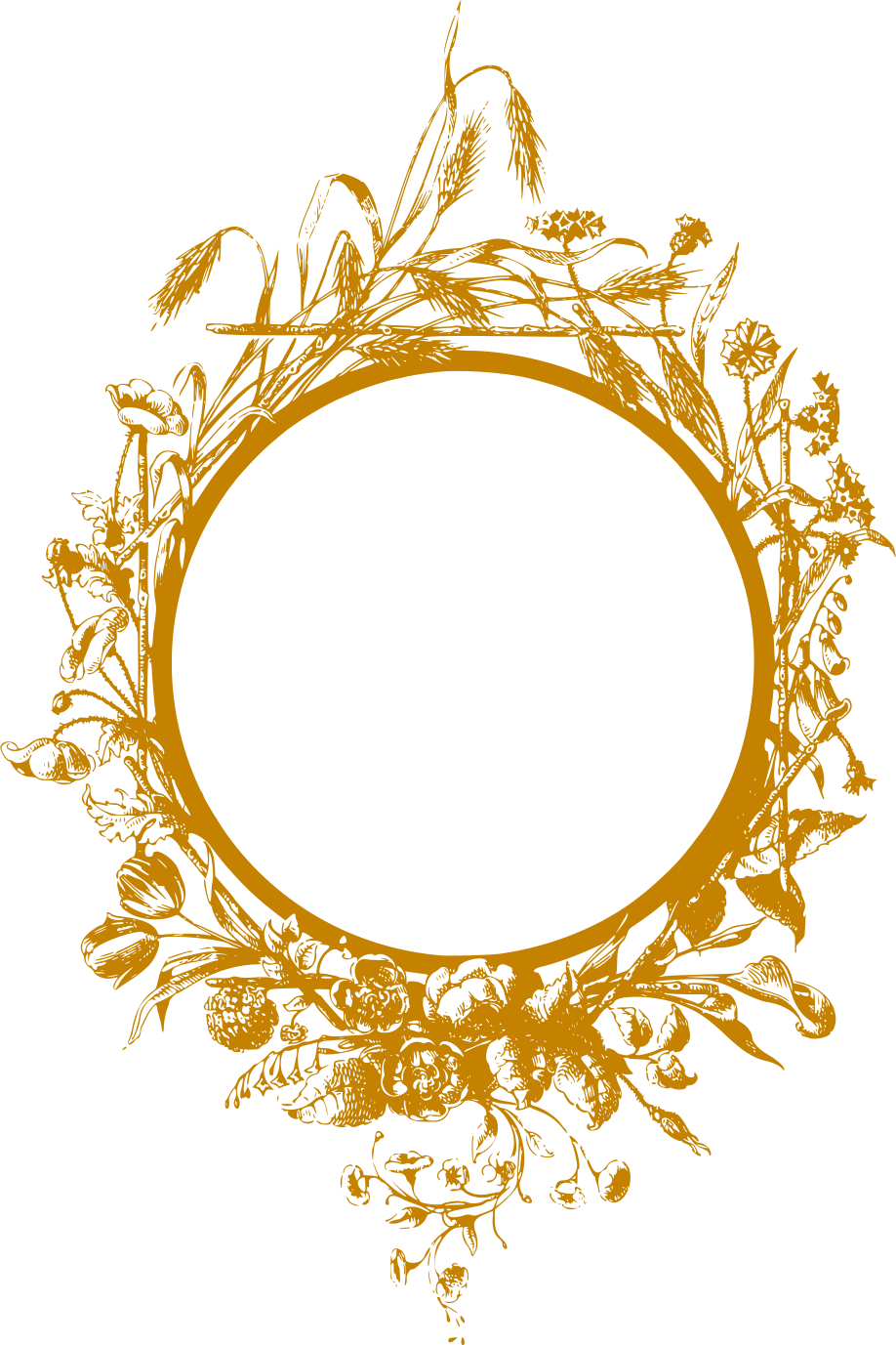 This features a beautifully designed circular frame with an ornate border. Inside the frame, there is a round circle that appears to be empty or unoccupied. The frame itself has a golden color and is adorned with various plants and flowers, creating a visually appealing design. The plants are scattered around the frame in different positions, adding depth and dimension to the overall composition of the image.