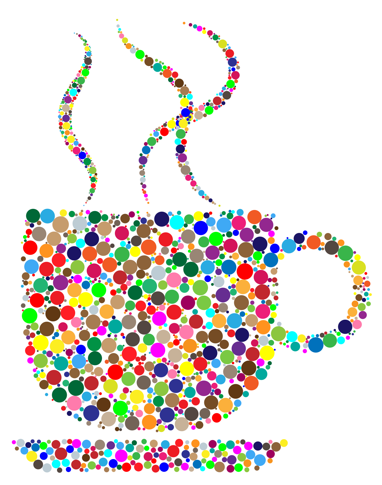 This features a colorful coffee cup with steam coming from it, indicating that the coffee is hot. The cup is made out of various colored circles, giving it an artistic and visually appealing appearance. The colors used in this design create a vibrant and lively atmosphere, making the coffee cup stand out as a unique and creative piece of art or decoration.