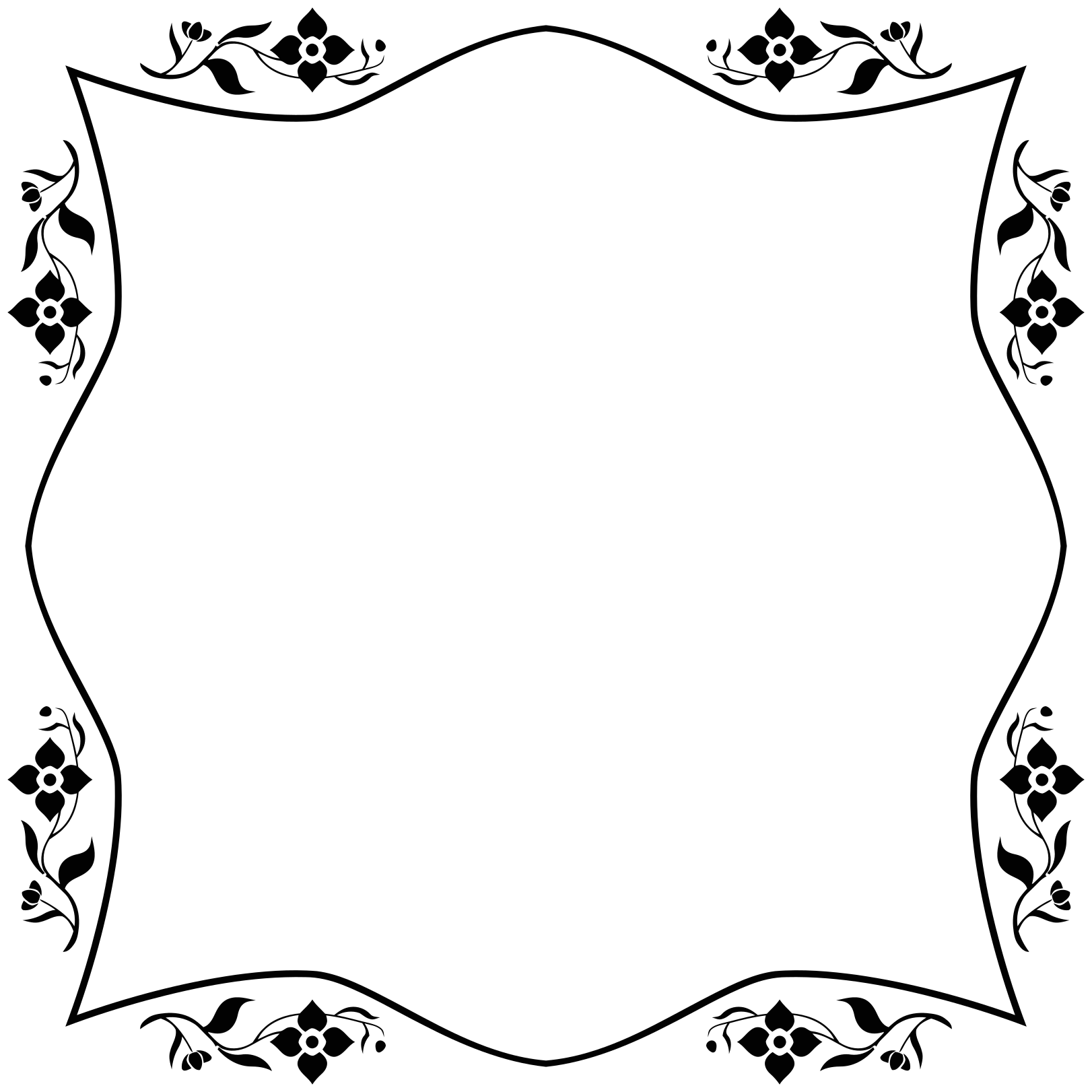 This features a white frame with a black outline, giving it an elegant appearance. Surrounding the outline are various flowers, adding a touch of nature and beauty to the design. These flowers come in different shapes and sizes, creating a visually appealing pattern that complements the overall look of the frame. The combination of the white background and the intricate floral details make this image an attractive piece of art or decoration for any space.