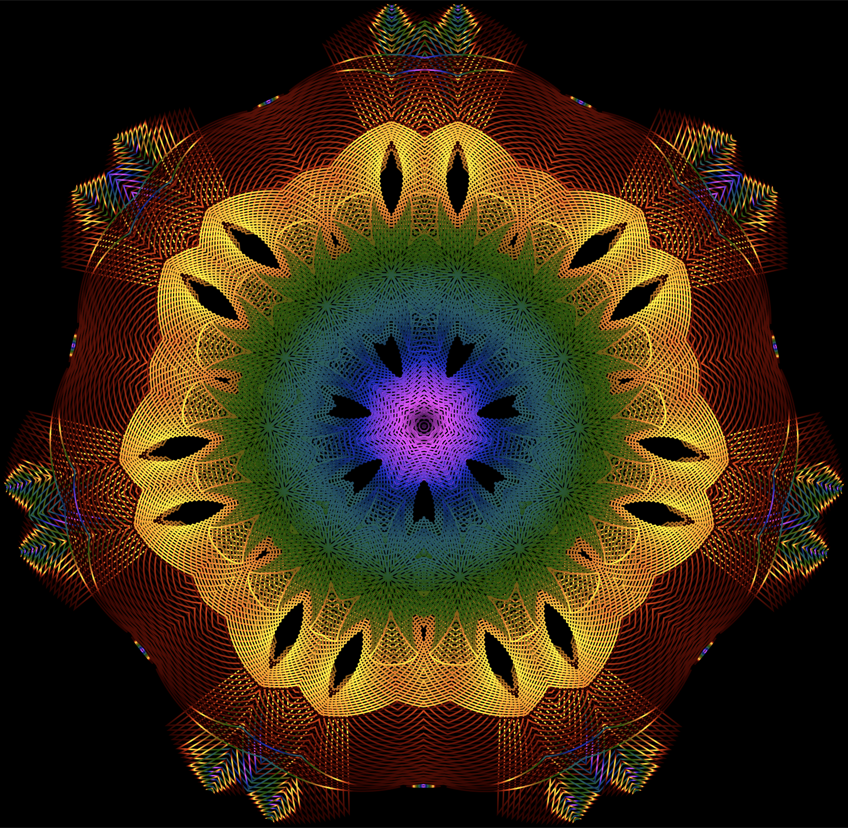 This features a large, colorful geometric design with an intricate pattern. The artwork is composed of various shapes and lines that create a visually striking composition. The colors used in the design are vibrant and bold, making it stand out against its black background. This unique piece of art could be used as a decorative element or even as a wallpaper to add a touch of creativity and personality to any space.