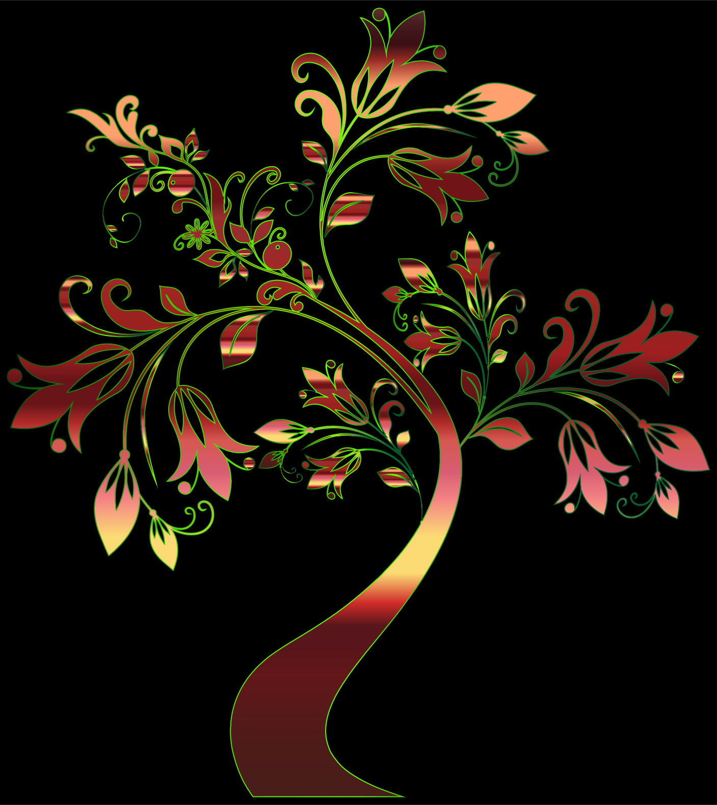 This features a tree with many leaves and flowers on it. It is an ornate, wavy tree that stands out against the black background of the picture. The tree has a vibrant color scheme, including reds and greens, which adds to its visual appeal. The intricate design of the tree's branches and leaves creates a sense of depth and complexity in the image. Overall, it is an eye-catching and artistic representation of nature.