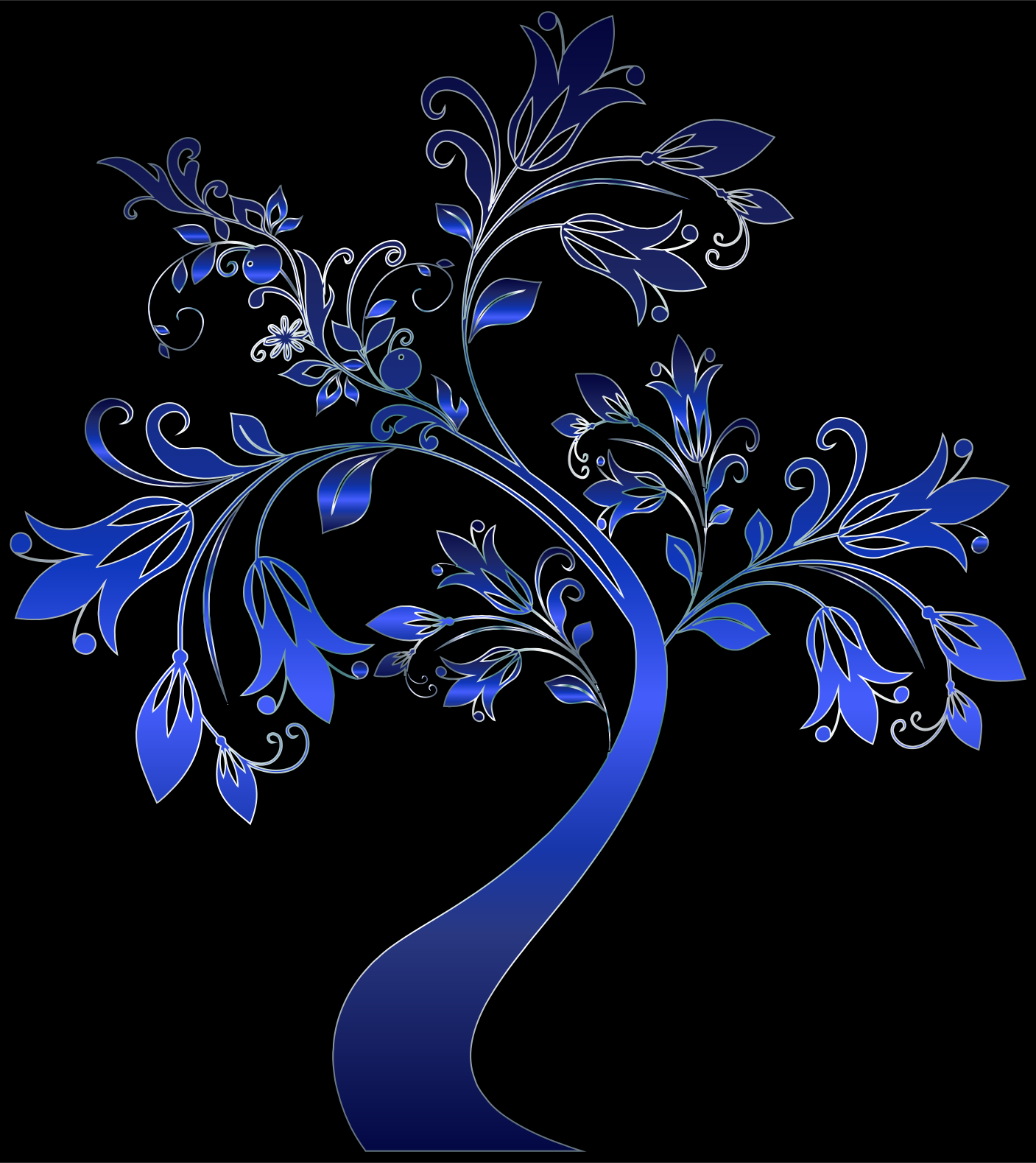 This features a blue tree with many leaves and flowers on it. The tree is wavy, giving it an artistic appearance. It appears to be a black and white picture of the tree, adding a sense of depth and contrast to the scene. The tree's branches are filled with intricate designs, making it a visually appealing piece of artwork.