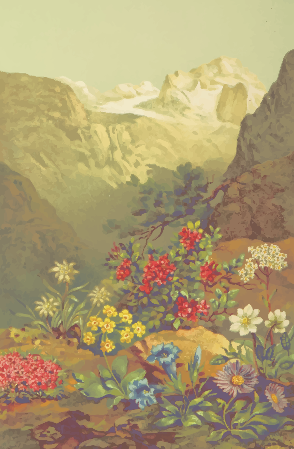 This features a beautiful mountain landscape with a variety of flowers scattered throughout the scene. There are several different types of flowers, including red and yellow ones, adding vibrant colors to the picture. In addition to the flowers, there is a mountain range in the background, creating an impressive backdrop for the colorful display. The combination of the lush greenery, the mountains, and the diverse array of flowers creates a serene and picturesque scene that captures the beauty of nature.