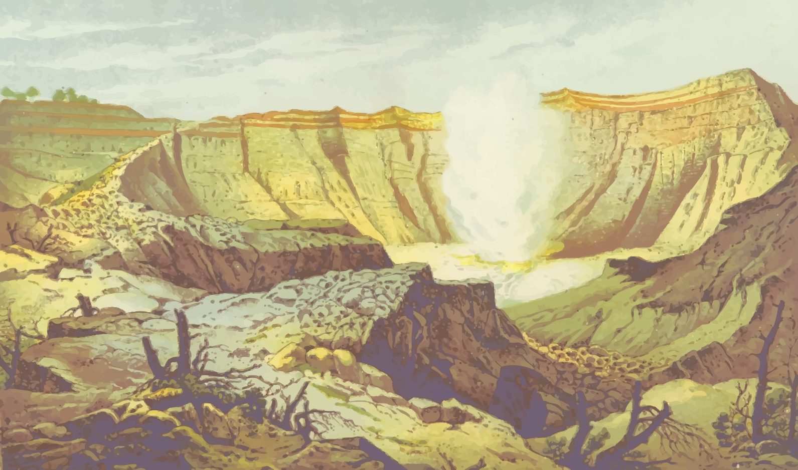 This depicts a large, open valley with a massive chasm in the middle. A waterfall is cascading down into this chasm, creating an impressive sight. The landscape around the chasm features a mix of dirt and rocky terrain, giving it a rugged appearance. In addition to the waterfall, there are several trees scattered throughout the valley, adding some greenery to the scene. Overall, the image captures the beauty and power of nature in this dramatic landscape.