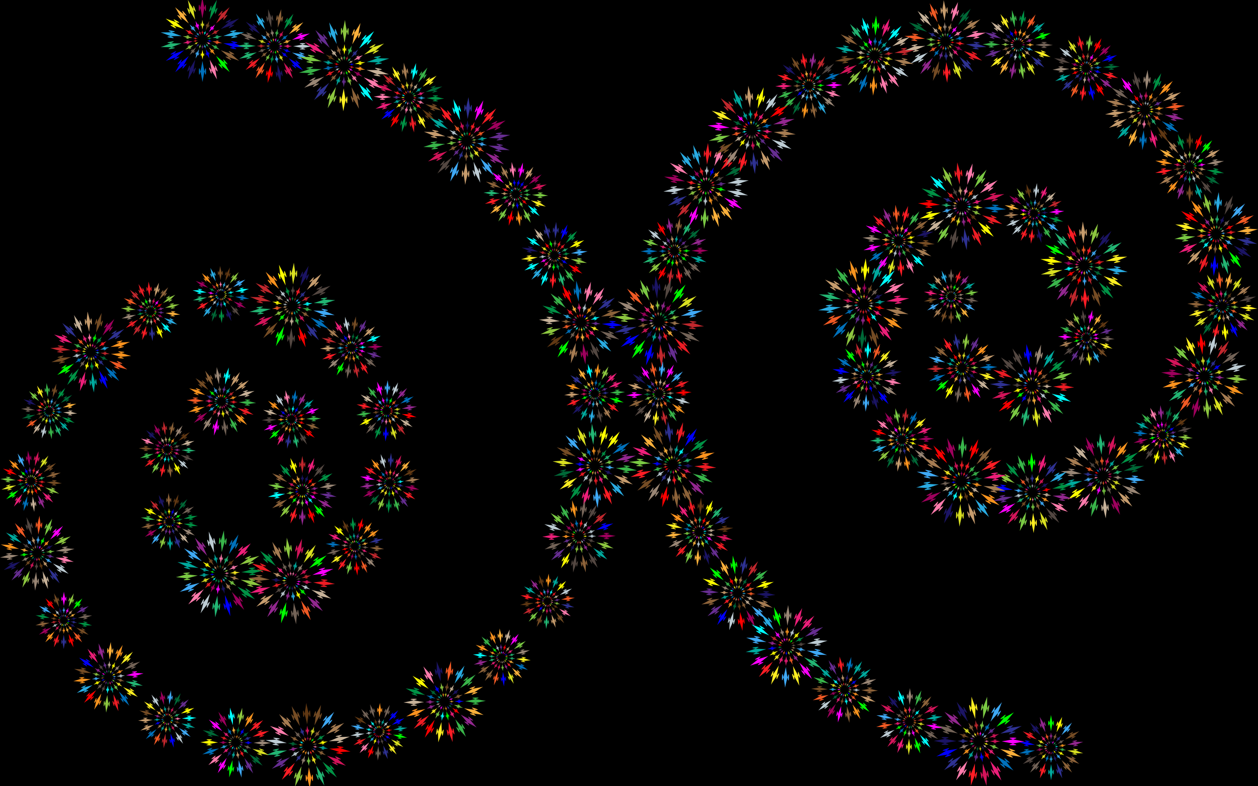 This features a black background with two large, colorful circles in the center. These circles are made up of many smaller circles arranged in a spiral pattern, creating an intricate and visually appealing design. The colors used for these smaller circles include red, green, blue, yellow, and orange, adding vibrancy to the overall composition. The two large circles appear to be connected by a line, further emphasizing their central position within the image.