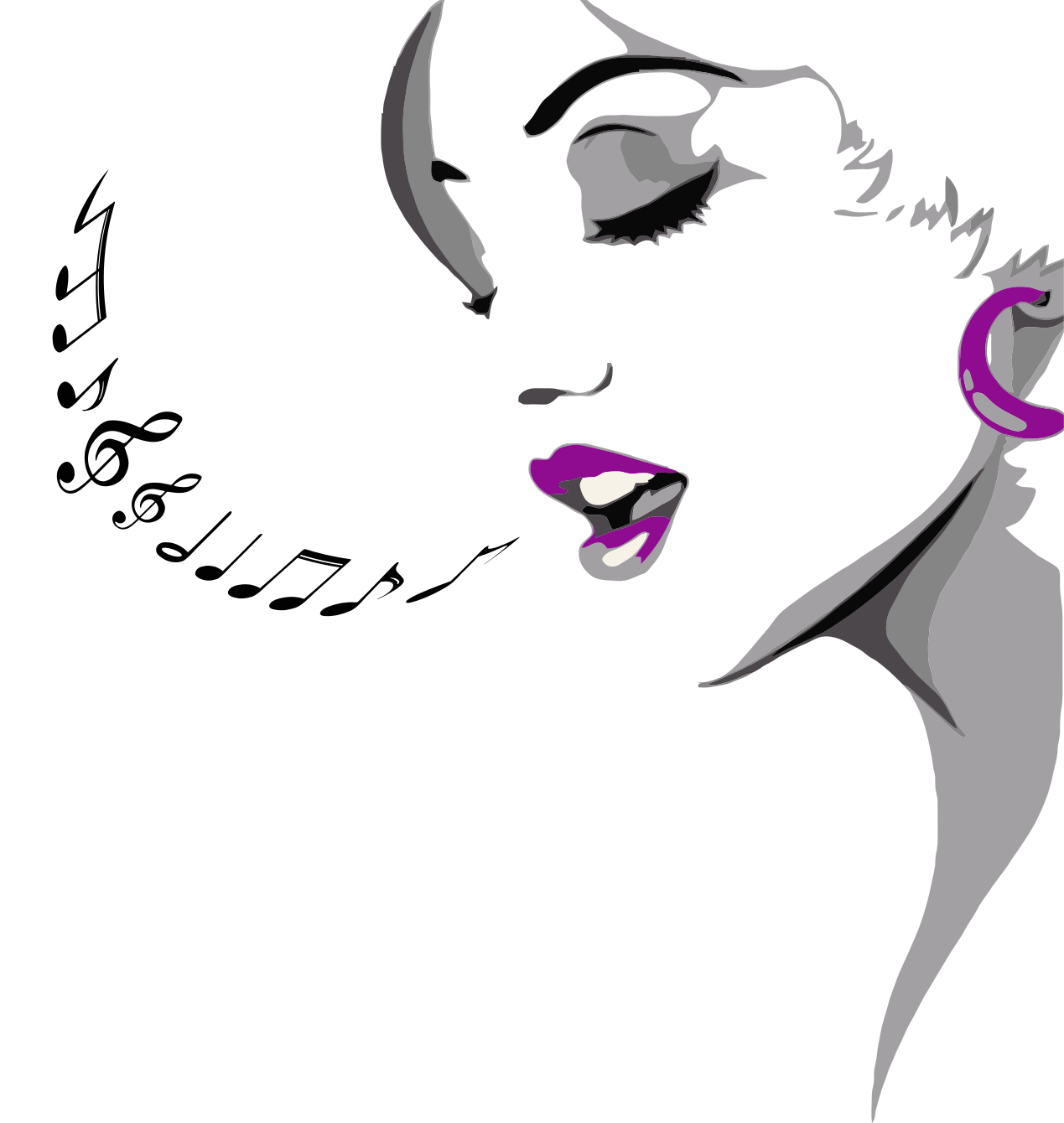 This features a woman with purple earrings, wearing lipstick and singing. She is shown from the side of her face, giving an impression of her mouth opening to sing. The notes are coming out of her mouth as she sings, creating a dynamic visual representation of her performance. The overall scene captures the essence of music and the artist's passion for it.
