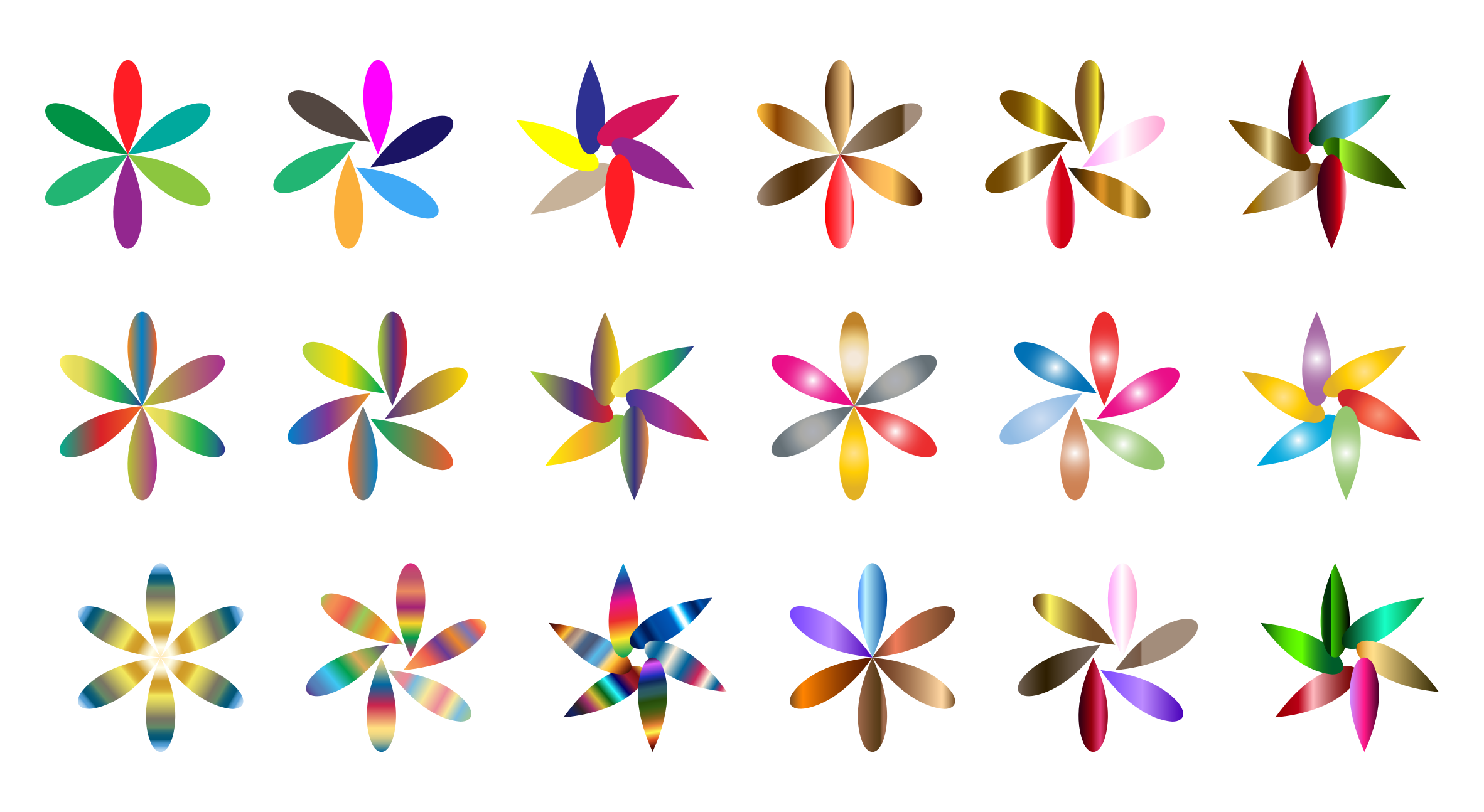 This features a collection of 18 colorful flower shapes, each with unique colors and patterns. These flowers are arranged in a visually appealing manner, creating an attractive display. The flowers come in various sizes and orientations, adding depth and interest to the overall composition. This artistic arrangement showcases the beauty of nature and the creativity involved in designing such intricate shapes.