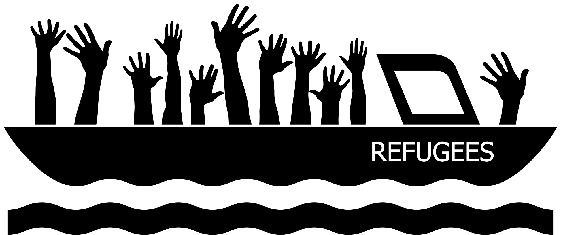 This features a boat with many hands reaching out from it, forming the word "refugees" in a creative manner. These hands are spread across various positions on the boat, creating an interesting visual effect. The boat itself is quite large and spans almost the entire width of the image. The hands are positioned at different angles and heights, giving the impression that they are reaching out to help those in need or seeking refuge. Overall, it's a powerful and thought-provoking representation of the concept of refugees.