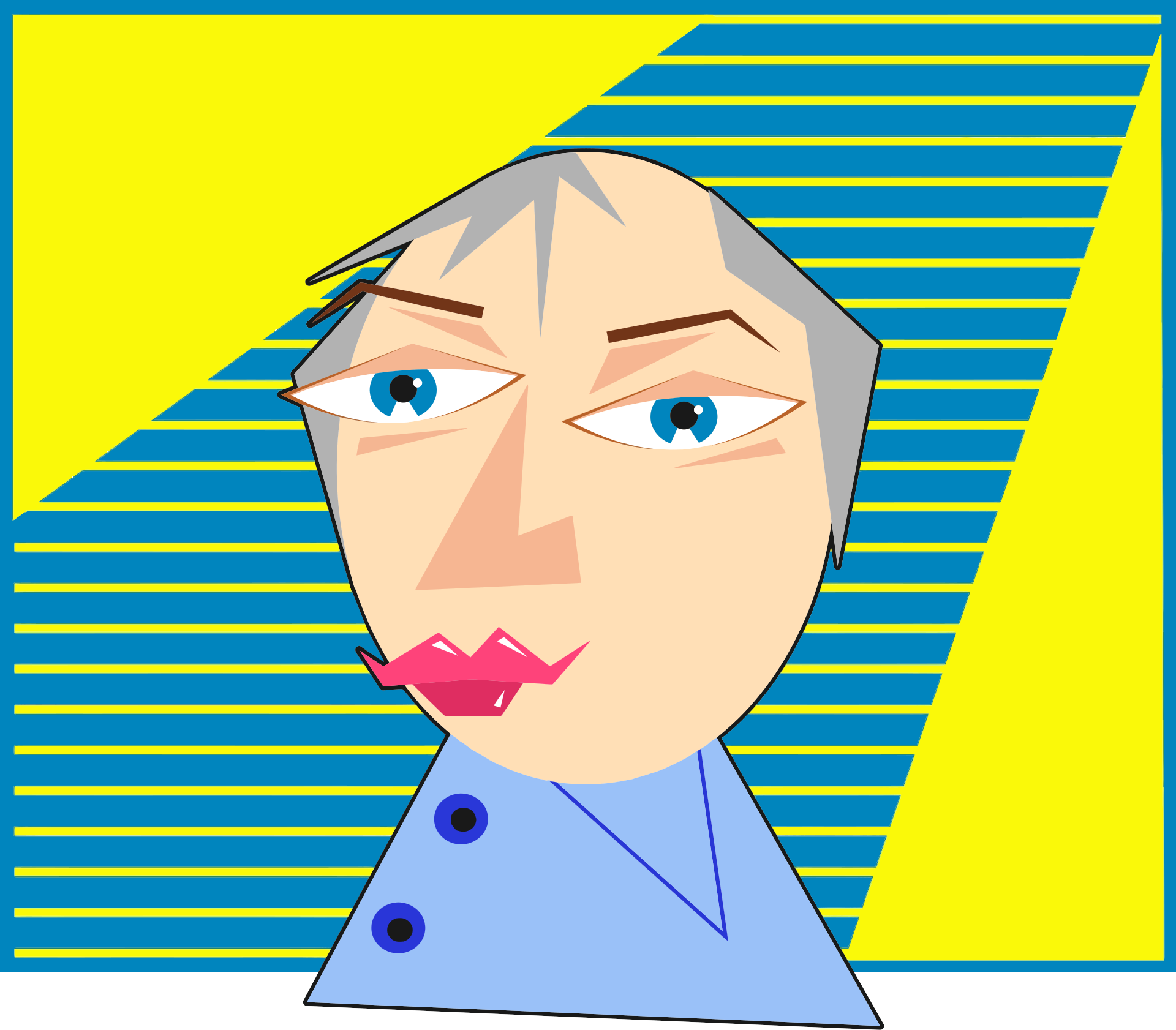 This features a cartoon-like drawing of an older man with blue eyes, wearing a blue shirt. He has a pink mouth and is looking directly at the camera. The drawing appears to be a close-up of his face, emphasizing his features. The overall style of the artwork gives it a comic book or animated feel.