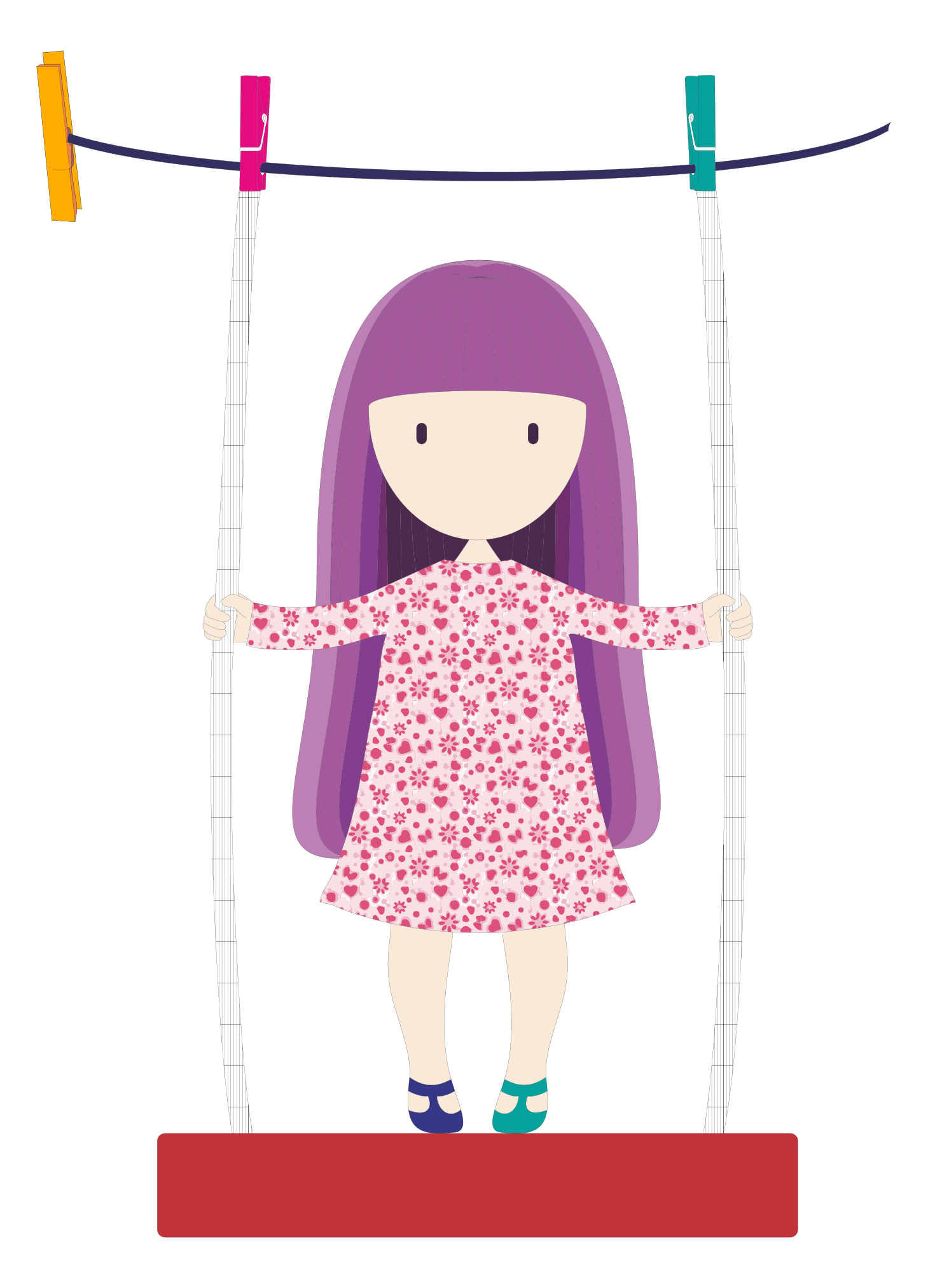 This features a cartoon girl with purple hair, wearing a pink floral dress and mismatched shoes. She is standing on a swing that is held up by clothespins attached to a string. The scene appears to be a playful and whimsical illustration of the little girl enjoying her time outdoors.