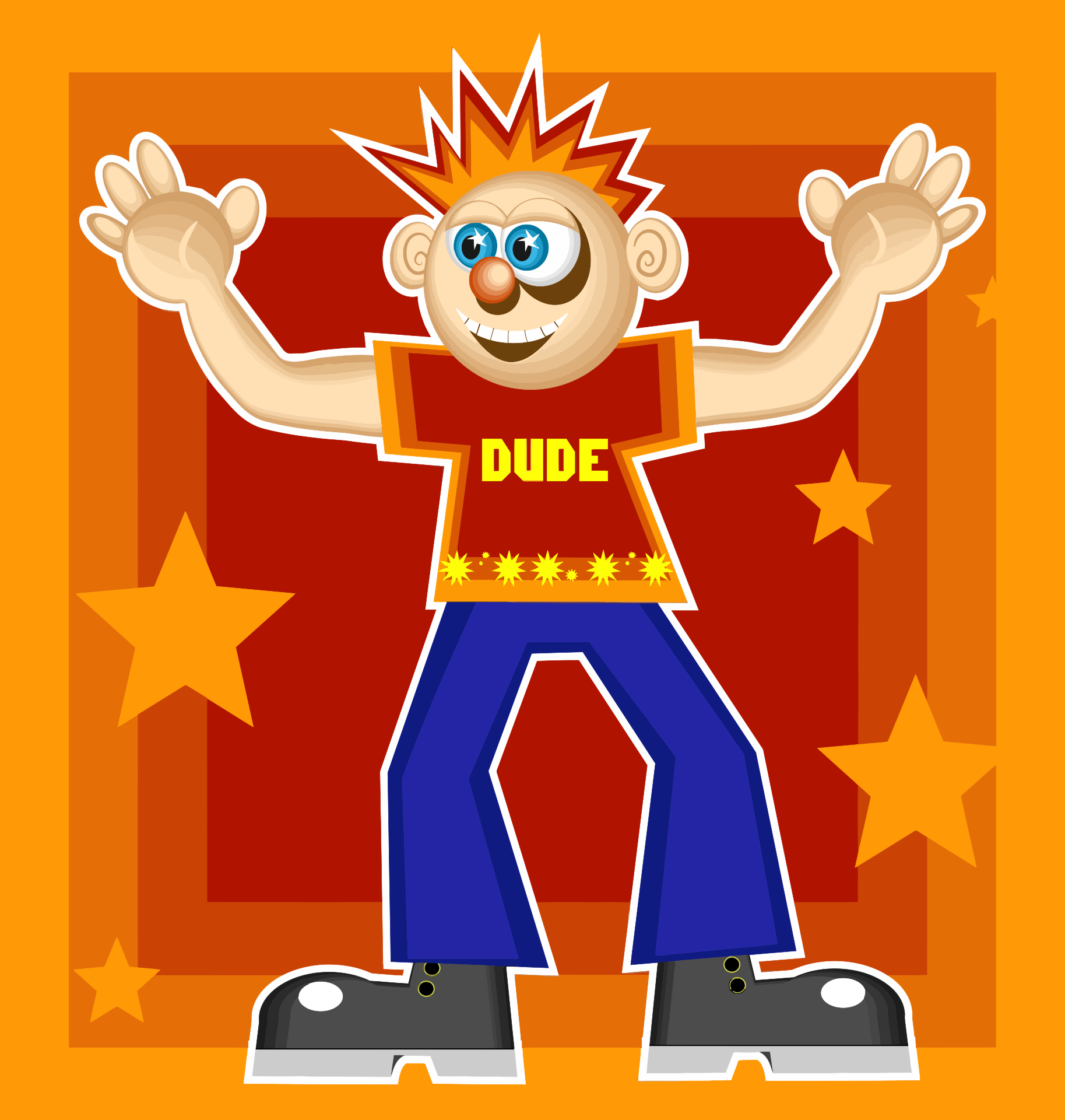 This features a cartoon character with red hair and an orange shirt that reads "Dude." This character is standing on one foot, giving the impression of being very cool. The background consists of a brightly colored star pattern, adding to the overall fun and playful atmosphere of the scene.