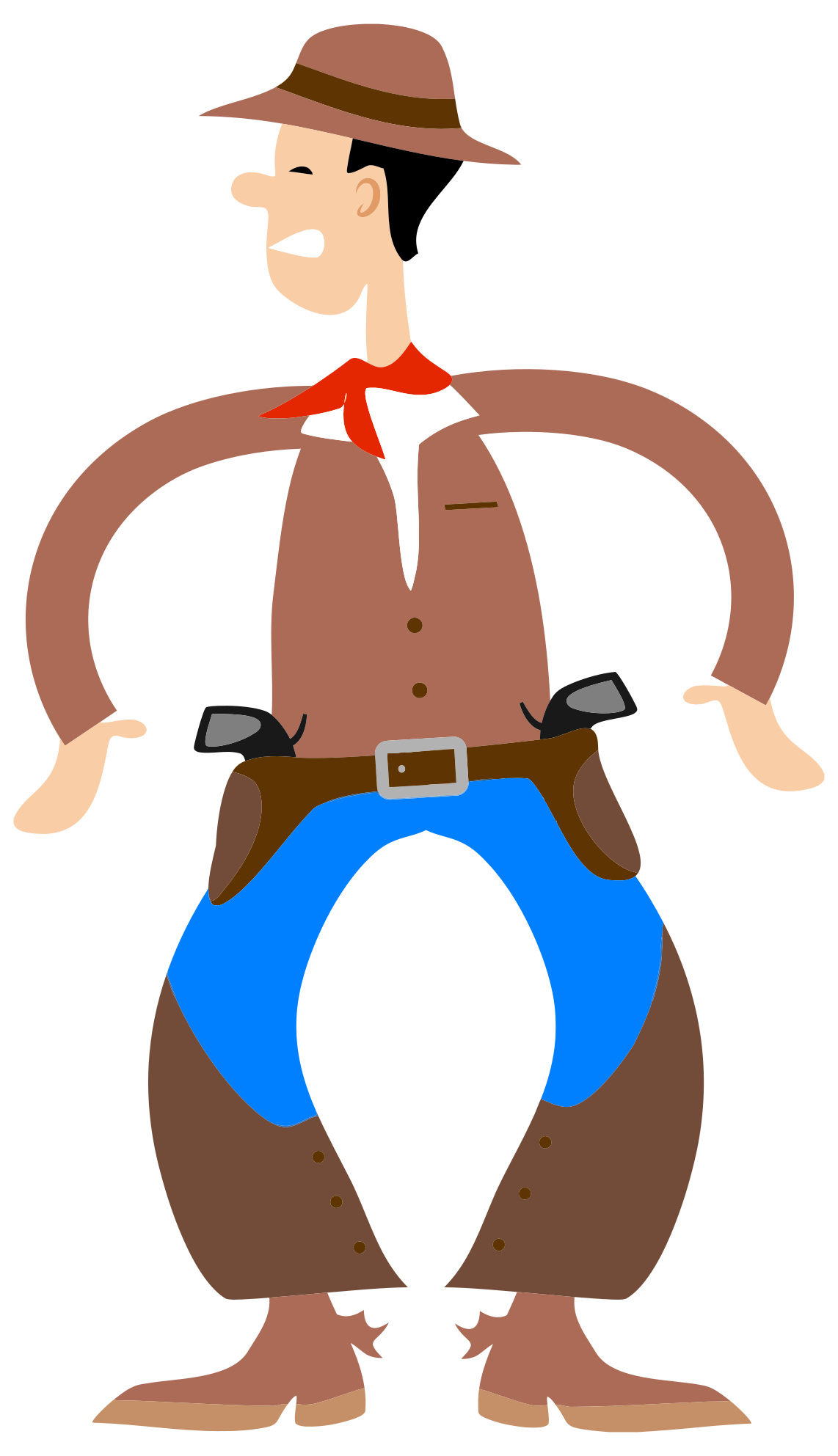 This features a cartoon cowboy dressed in a brown outfit, complete with blue jeans and a belt. He is holding two guns on his hip, giving him the appearance of a classic western character. The cowboy has a smile on his face, adding a playful touch to the scene. This colorful illustration captures the essence of a traditional cowboy figure in a fun and engaging manner.