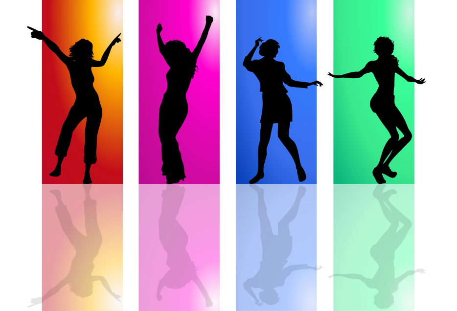 This features four silhouettes of people dancing, each with a different color background. They are all wearing tight clothing and appear to be enjoying themselves as they dance. The colors used for the backgrounds include pink, blue, green, and yellow, creating an interesting visual effect. Each person's silhouette is distinctly visible, showcasing their unique dancing styles and movements.