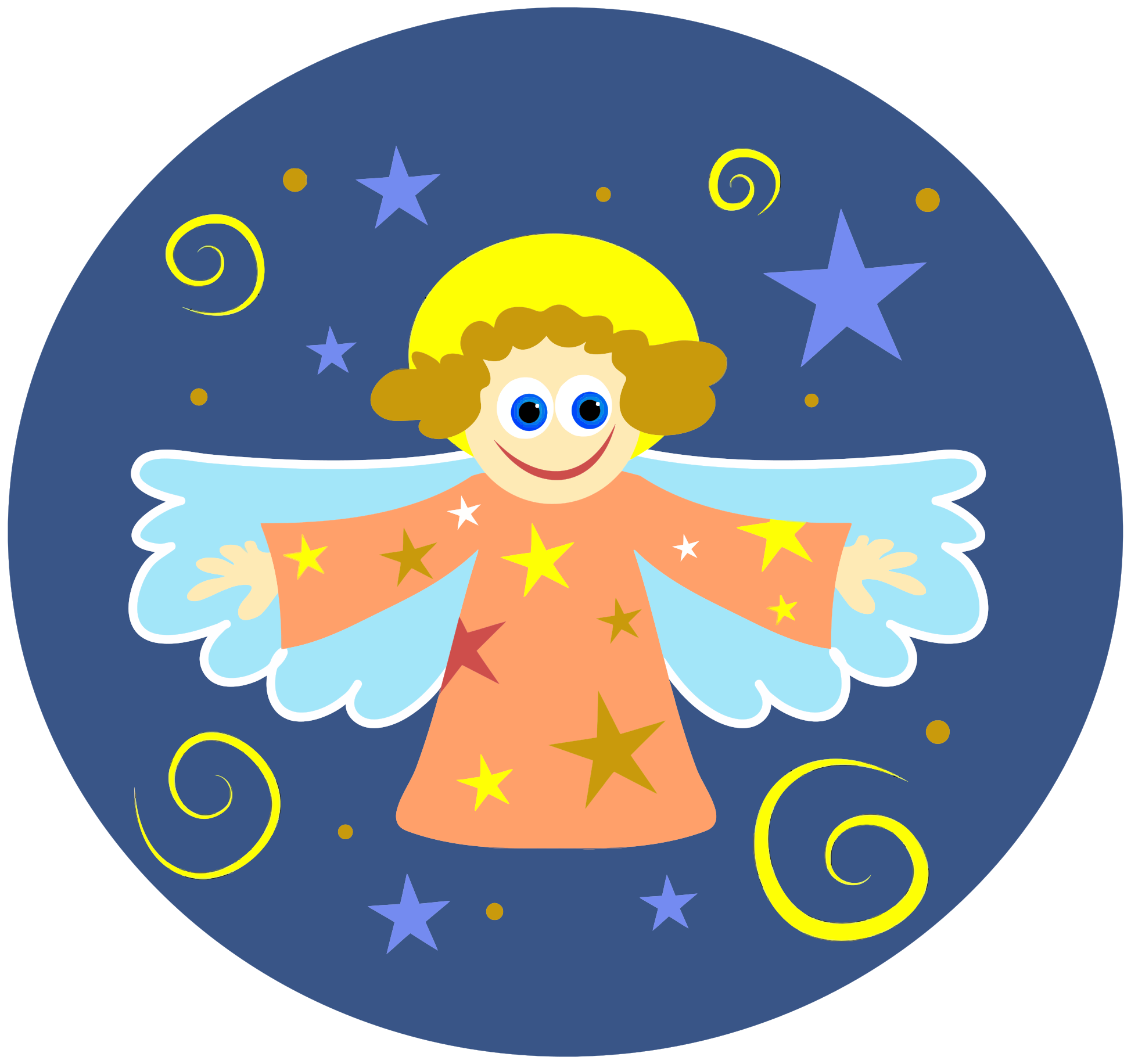 This features a cartoon angel with blue wings, wearing an orange shirt and a yellow hat. It is smiling and appears to be flying through the night sky. The background of the image has a starry backdrop, adding to the celestial atmosphere. The overall scene gives off a sense of warmth and happiness, as the angel seems to be enjoying its time in the sky.