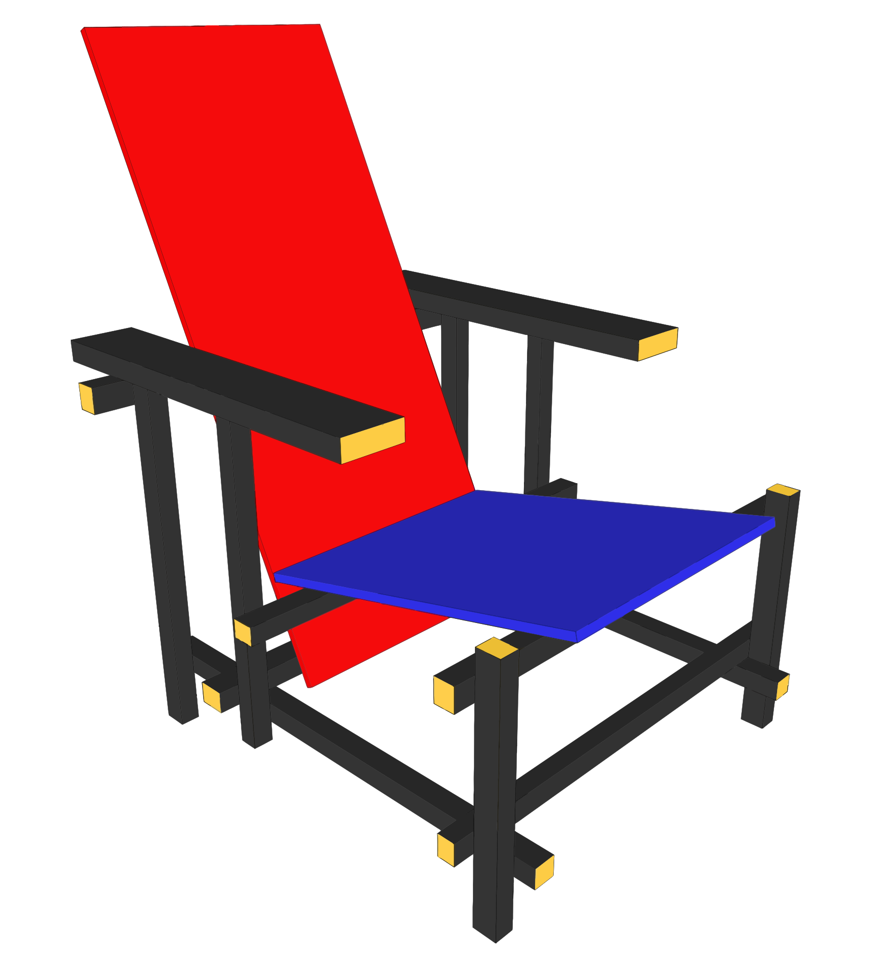 This features a 3D model of an empty blue and red chair. The chair is made up of several wooden pieces, giving it a unique appearance. The blue portion of the chair is located on the left side, while the red portion spans across the right side. The chair appears to be a comfortable seating option for those who enjoy its vibrant colors.