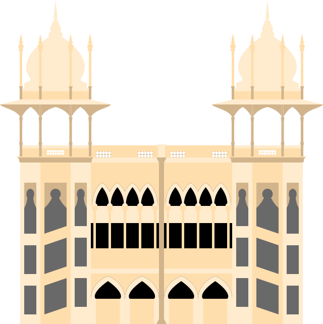 This features a large, ornate building with two prominent towers. These towers are adorned with intricate designs and decorative elements, giving the structure an impressive appearance. The building appears to be made of stone or brick, adding to its grandeur. The architecture suggests that it could be a palace or another significant historical landmark. The overall scene is reminiscent of a painting or drawing, showcasing the beauty and craftsmanship of the structure.