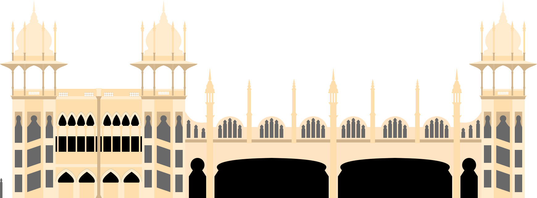 This features a large, ornate palace with three towers. It is constructed of yellow bricks and has numerous windows adorning its facade. The palace appears to be an architectural marvel, showcasing intricate details and design elements that make it stand out as a prominent landmark in the area.