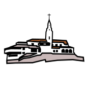 This features a church with a tower and cross on top. The church is situated atop a hill, giving it an elevated appearance. The building has a brown roof, adding to its charm. The church's architecture appears to be old-fashioned, making it stand out as a historical landmark in the area.