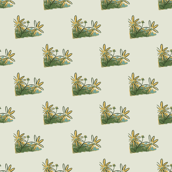 This features a pattern of yellow flowers on a beige background. There are several different types of flowers in the design, each with varying shapes and sizes. Some of the flowers have long petals, while others have shorter ones. Overall, the pattern creates an eye-catching and visually appealing decoration that can be used for various purposes such as wallpaper or fabric designs. The combination of yellow and beige colors adds a warm and inviting touch to any space where this pattern is used.