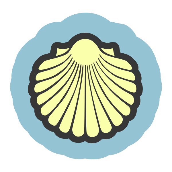 This features a scallop shell, which is an emblem commonly associated with seashells. This particular scallop shell has a yellow and black color scheme, making it stand out against the blue background of the image. The shell's design includes intricate patterns that add to its visual appeal. The scallop shell is often used as a symbol or decorative element in various contexts, such as on clothing, accessories, or even in artwork.
