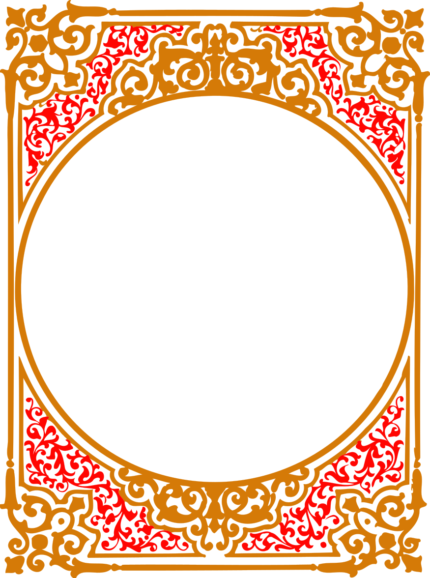 This features a decorative frame with an ornate design, including red and gold colors. Inside the frame is a round circle or oval shape that appears to be empty, giving it a clean and uncluttered look. The overall effect of the frame is elegant and sophisticated, making it suitable for various artistic purposes such as paintings or other decorative items.