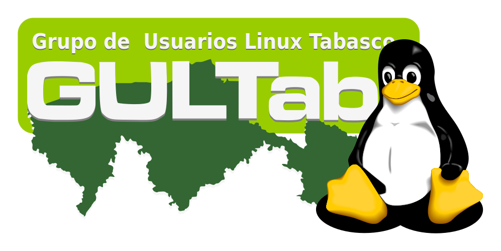This features a penguin, which is the mascot of Linux, sitting on top of a map of the world. The penguin appears to be wearing a hat and holding a book in its hands. The background consists of a green and white color scheme with a few other smaller figures scattered around the scene. This image likely represents the Linux LUG (Linux User Group) in Tabasco, showcasing their logo and mascot.