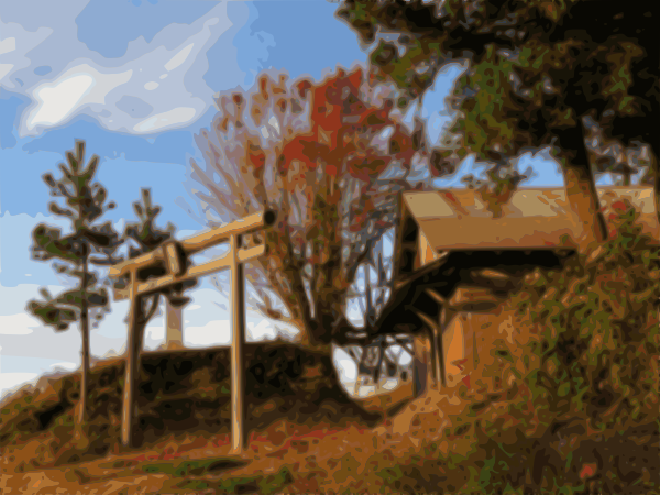 This features a small wooden house situated on top of a hill, surrounded by trees. In front of the house, there is an old-fashioned shrine with two torii gates standing in front of it. These gates are made from wood and have a rustic appearance. The scene appears to be set during autumn, as evidenced by the presence of red leaves on the trees surrounding the area. The combination of the house, shrine, and trees creates a serene atmosphere that is characteristic of this location.