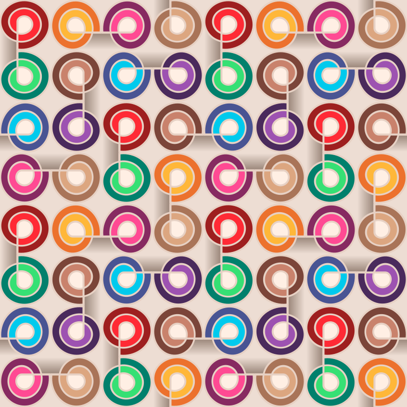 This features a pattern made up of various colored rings. These rings come in shades of orange, blue, purple, red, pink, and brown. They are arranged in a way that creates an interesting visual effect, with the different colors blending together to form a cohesive design. This pattern could be used for decorative purposes or as part of a larger artistic project. The combination of these vibrant colors makes it an eye-catching and lively piece of artwork.