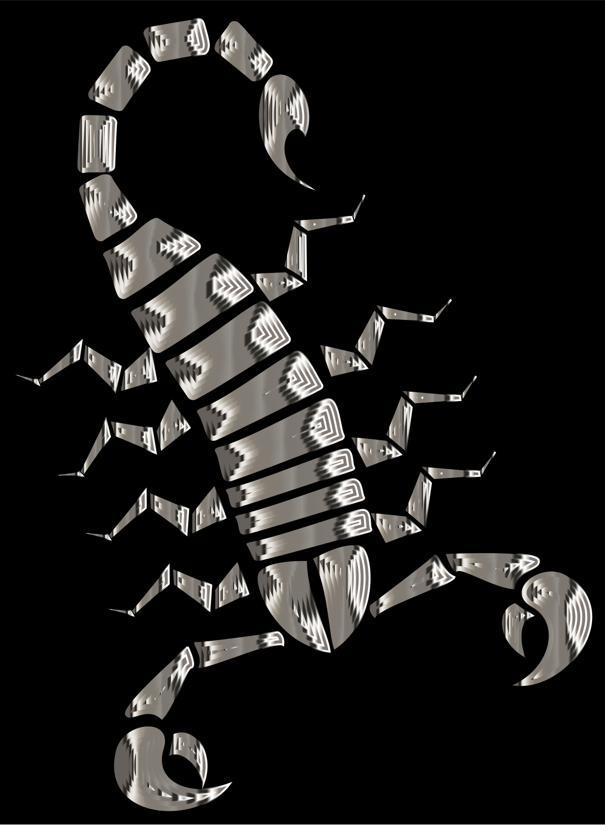 This features a black and white scorpion with its tail raised, standing on top of a dark background. The scorpion has eight legs, each one positioned at different angles to create the illusion of depth in the image. The scorpion's body is elongated, giving it an imposing appearance. This unique design makes for an interesting and captivating visual representation of the scorpion.