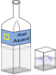 This features a bottle of aquavit liquor, which is a type of brandy. The bottle has a yellow label with the name "Axel Aquavit" written on it. Next to the bottle, there are two small cubes made out of ice, likely used for serving or chilling the drink. This scene suggests that someone might be preparing to enjoy a cold glass of aquavit liquor, either by themselves or with others.