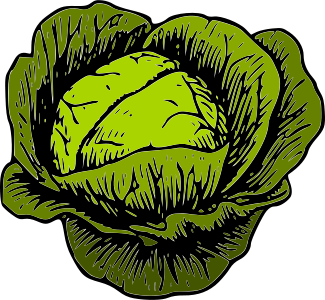 This features a large, green cabbage with a light green center. It is depicted in black and white, giving it an old-fashioned appearance. The cabbage has dark green leaves surrounding the center, adding to its visual appeal. This illustration captures the essence of a freshly picked cabbage, showcasing its vibrant colors and natural beauty.