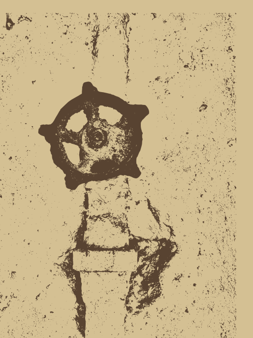 This features a rusty pipe with an old valve attached to it. The valve has a black outline and is part of the pipe, giving it a vintage appearance. The background of the image is sand-colored, which adds to the aged look of the scene. The overall atmosphere suggests that this could be an old building or structure with a history of wear and tear.