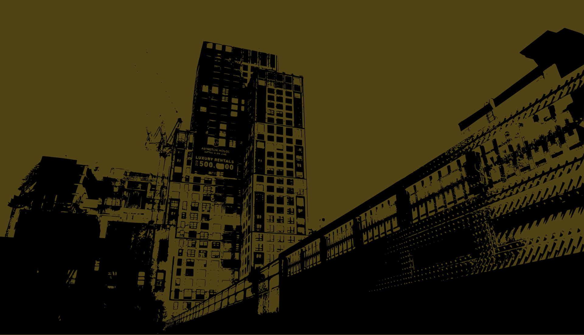 This depicts a city skyline with tall buildings, including one that is taller than the others. The buildings are black and orange in color, creating an interesting contrast against the sky. The scene appears to be taken from a distance, giving a sense of depth and perspective to the urban landscape. The overall atmosphere suggests a bustling city environment filled with activity and energy.