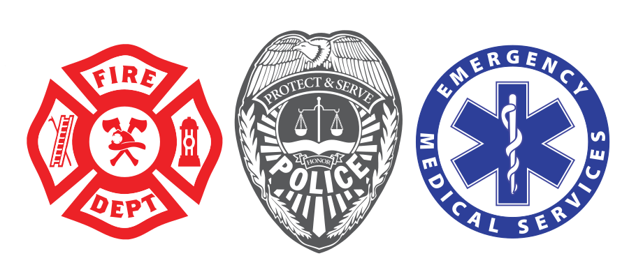 This features three emblems representing various first responder services. The first emblem is a red fire department badge, which signifies the fire station's presence and readiness to respond to emergencies. The second emblem is a police badge, indicating law enforcement's role in maintaining order and ensuring public safety. Lastly, there is an EMS (Emergency Medical Services) badge, representing the medical professionals who provide immediate care during emergencies. These three emblems are displayed together to showcase the collaboration between these first responder services in times of crisis.