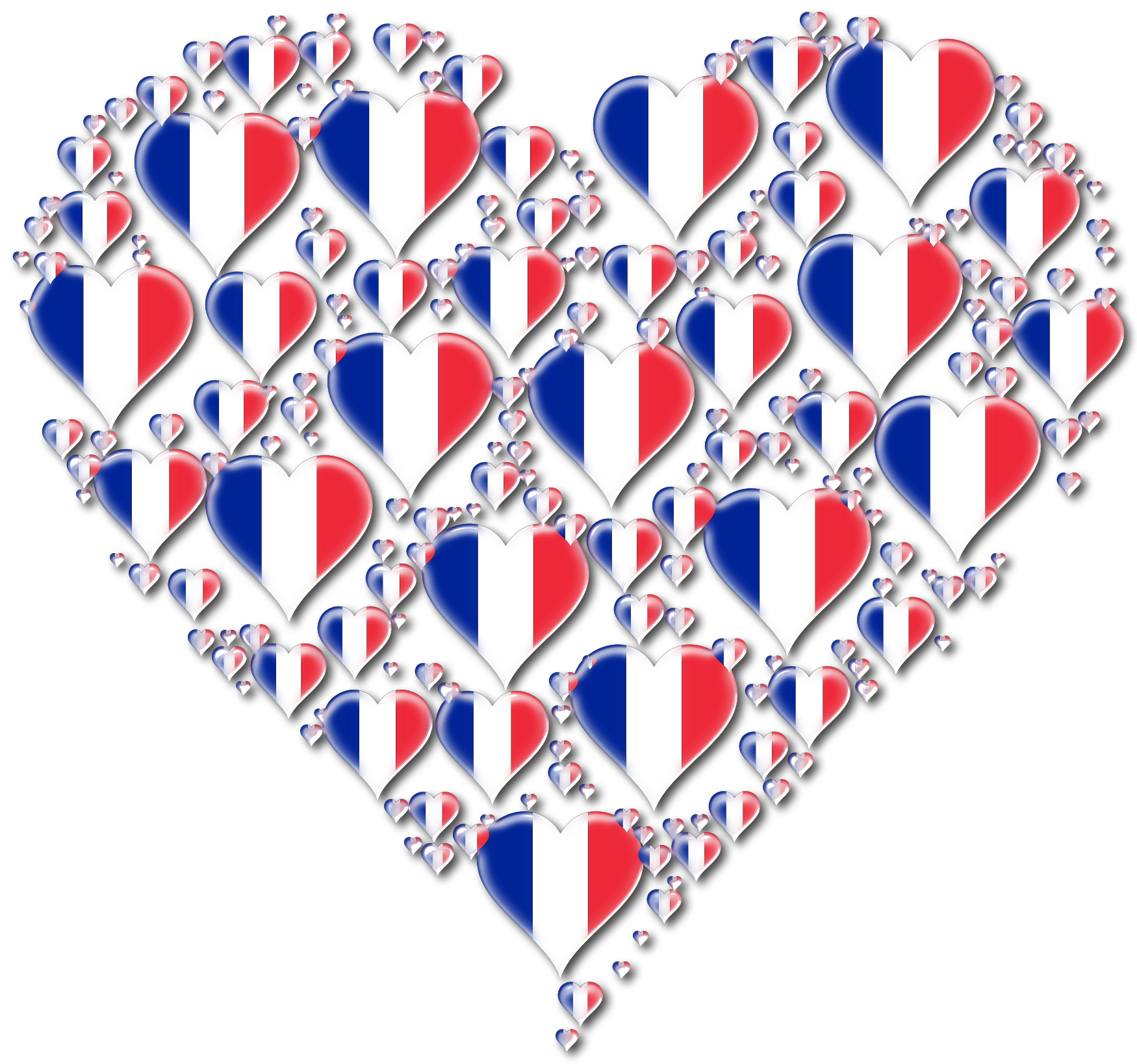This features a large heart made up of smaller hearts, each containing the French flag. There are numerous hearts in various sizes and positions throughout the scene, creating an intricate and visually appealing design. The hearts are scattered across the entire frame, with some located near the top left corner, others in the middle section, and more towards the bottom right side of the image. This creative arrangement showcases a unique and eye-catching representation of love using the French flag as its central theme.